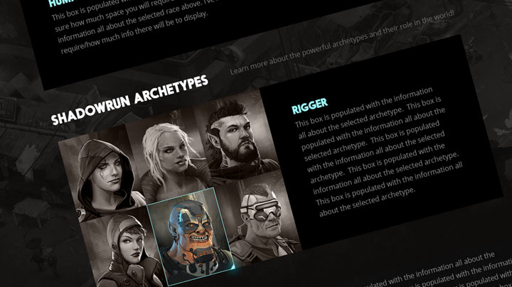 When the guys at Hairbrained Schemes got in touch it certainly made my day! Most people know the Shadowrun series well so having the chance to work on a site that would bring the series together into one home was very exciting indeed! There is such an incredible wealth of artwork that spans the series so I had plenty to work with. The final design is one that plunges the user deep into the dark, gritty universe of Shadowhand via a mixture of rich textures and futuristic hues.